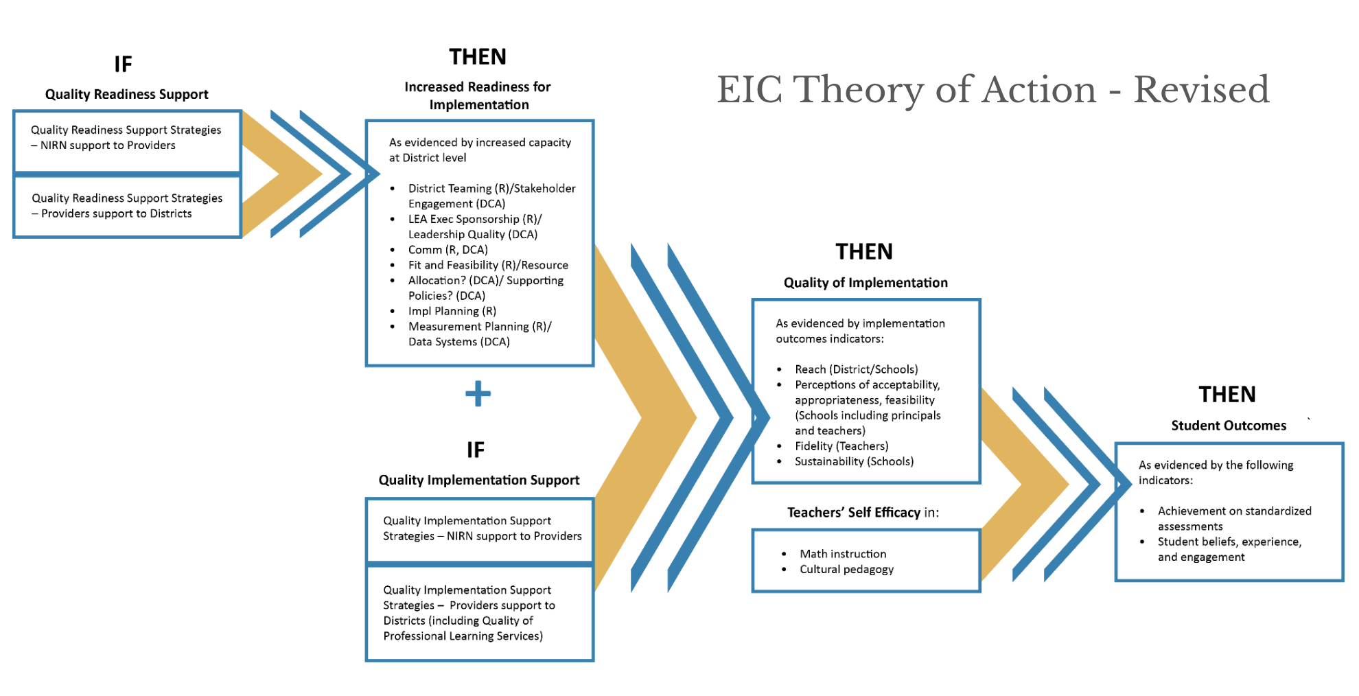 In this brief executive summary, key findings are synthesized across learning questions using the framing of the EIC Theory of Action (TOA). It examines how implementation impacts the system, from implementation strategies and their relation to district implementation outcomes, to the impact on teacher implementation perceptions and self-efficacy for instruction, to student outcomes.